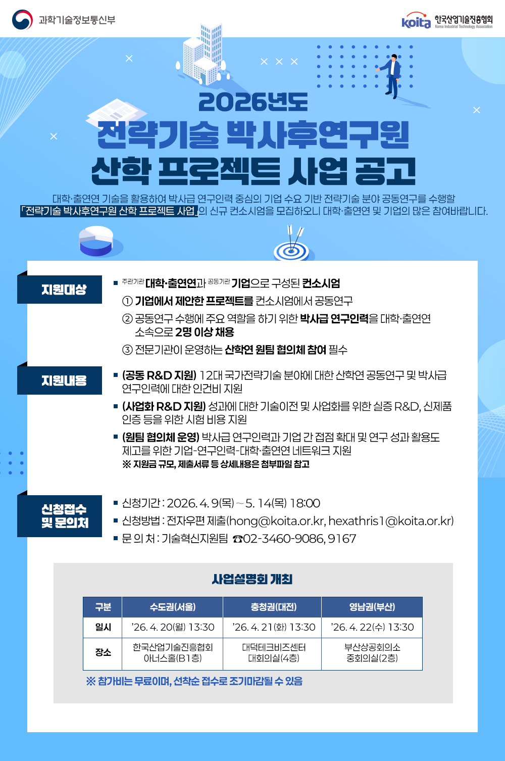 | 2026년도 전략기술 박사후연구원 산학 프로젝트 사업 공고 | |||