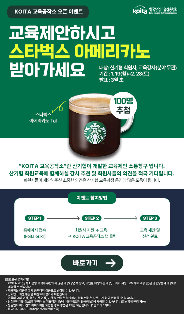 공지사항 KOITA가 산업기술혁신의 파트너로서 내일을 준비하고 미래를 선도할 수 있도록 관심과 지원 부탁드립니다. 사업공고 상세내용보기입니다. KOITA 교육공작소 오픈 이벤트 안내 등록일 등록일 2026-01-22 조회수 조회수 59 내용 내용 이전글 2026년도 KOITA 교육 일정 및 프로그램 안내 2026-01-22 제82회 산기협 조찬세미나 참가안내 2026-01-22 다음글 목록으로