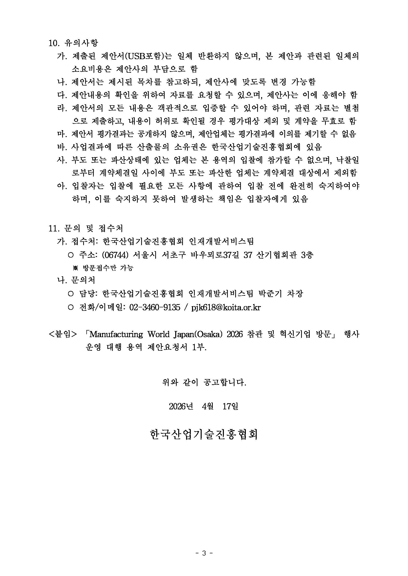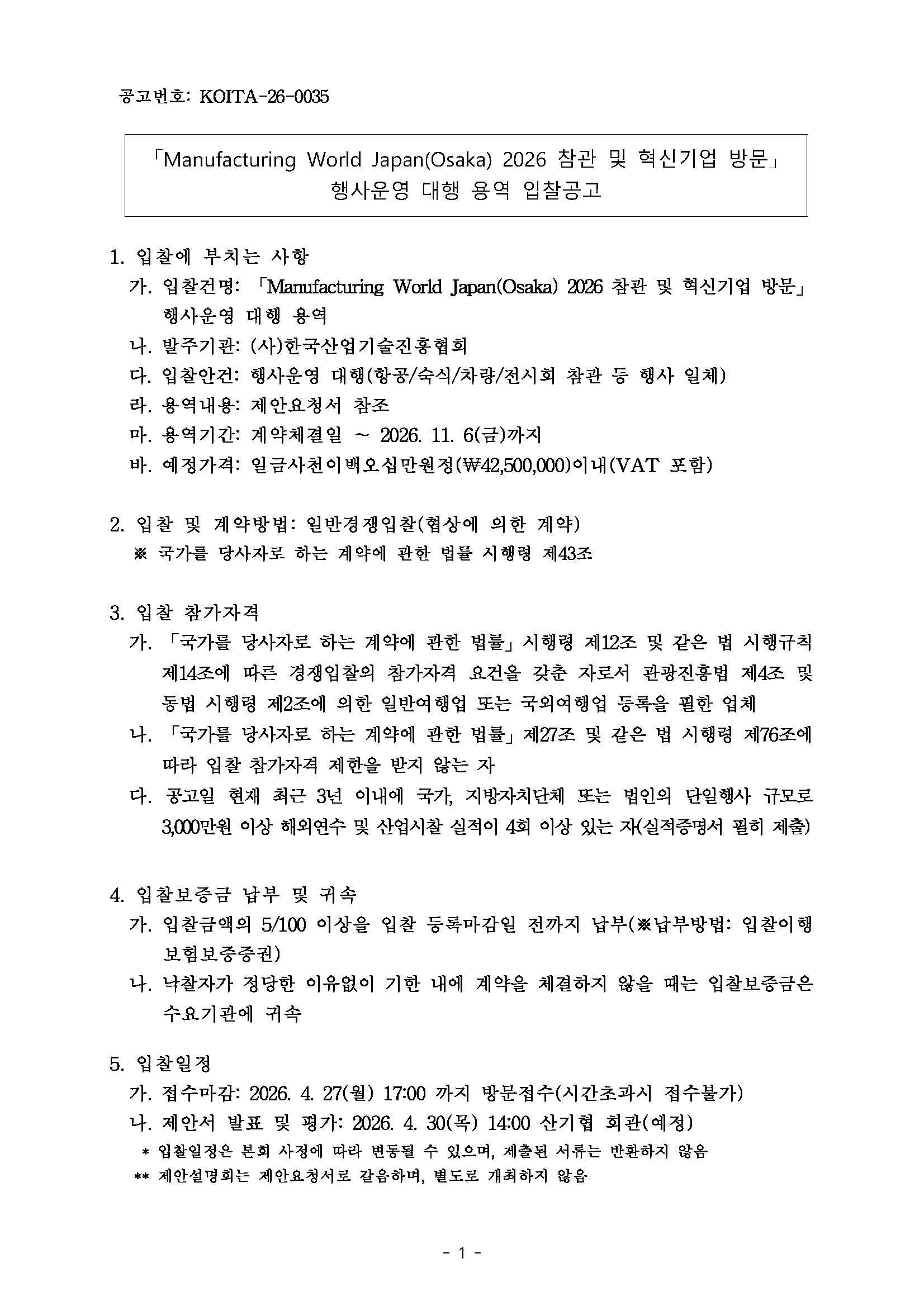 | [입찰공고] 일본 MWJ(오사카) 2026 참관 및 혁신기업 방문 행사운영 대행 용역 입찰공고 | |||