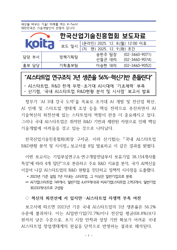 | [보도자료] 국내 AI 스타트업 R&D 현황 분석 및 시사점 보고서 발표 | |||