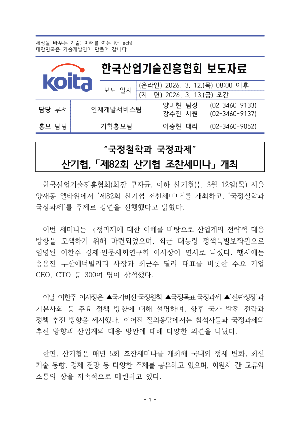 | [보도자료] 제82회 산기협 조찬세미나 개최 | |||