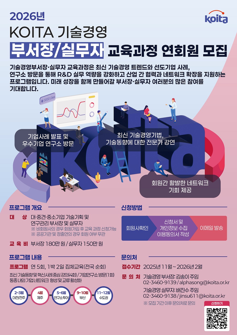 주요행사 및 교육 KOITA가 산업기술혁신의 파트너로서 내일을 준비하고 미래를 선도할 수 있도록 관심과 지원 부탁드립니다. 사업공고 상세내용보기입니다. 2026년 KOITA 기술경영부서장/실무자 연회원 모집 안내 등록일 등록일 2025-12-10 조회수 조회수 86 내용 내용 이전글 2026년 차세대 CTO 교육과정(NexCTO) 5기 참가안내 2025-11-10 다음글이 없습니다. 다음글 목록으로