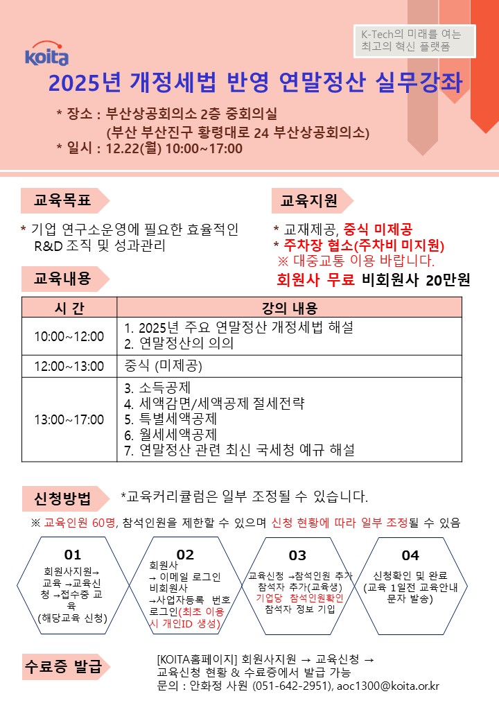 교육정보 교육정보 : 교육명, 장소, 일시, 금액, 담당자, 연락처, 참석가능 인원 [영남권] 2025년 개정세법 반영 연말정산 실무강좌 교육명 교육명 [영남권] 2025년 개정세법 반영 연말정산 실무강좌 장소 장소 부산상공회의소 2층 중회의실 (부산 부산진구 황령대로 24 부산상공회의소) 일시 일시 2025-12-22 10:00~17:00 금액 금액 비회원 : 200,000원 / 회원 : 무료 담당자 담당자 안화정 연락처 연락처 051-642-2951 정원 정원 60 명 교육설명 교육설명 내용 목록 신청하기