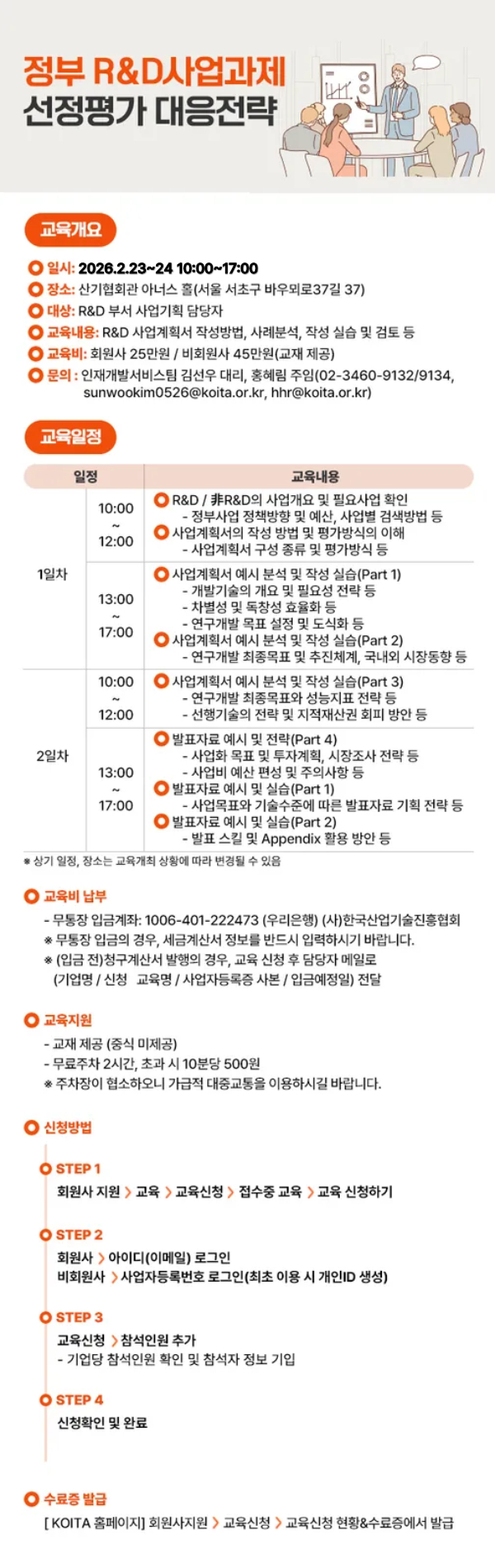 | 내용 | 안녕하세요. 교육강사는 본회 "AI 실습으로 완성하는 맞춤형 R&D 정부사업 사업계획서" 및 "AI를 활용한 R&D 사업계획서 전략 가이드" 교육과 동일합니다. 이 부분 참고하여 주시기 바랍니다. 아울러 2026년 정부 R&D사업 신청예정 기업을 대상으로 교육합니다. 그 외 목적(컨설팅 등)으로의 참가는 양해하여 주시기 바랍니다. ※ 본 교육은 2026년 초 마지막 교육으로 추가 개최는 없습니다.