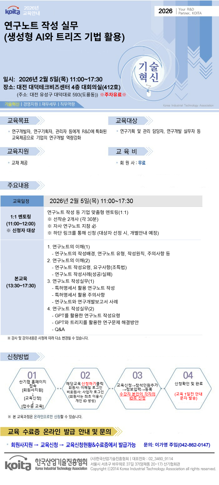 - 일시 : 2026년 2월 5일(수) 11:00~12:00 (※ 본교육 13:30~17:30) - 신청대상 : 회원사 임직원 (선착순 2개사, 기업당 30분) - 준비물 : 피드백을 요하는 자사 연구노트 (미지참 시, 멘토링 진행이 불가할 수 있습니다.) - 신청방법 : ① KOITA 홈페이지를 통해 교육 신청 ② 구글폼으로 멘토링 신청 ※ 선정 여부 등 개별적으로 안내 예정이므로 정확한 정보를 입력해주시길 바랍니다. ※ 멘토링 미신청자는 본교육 시간(13:30)까지 착석하여 주시길 바랍니다. |